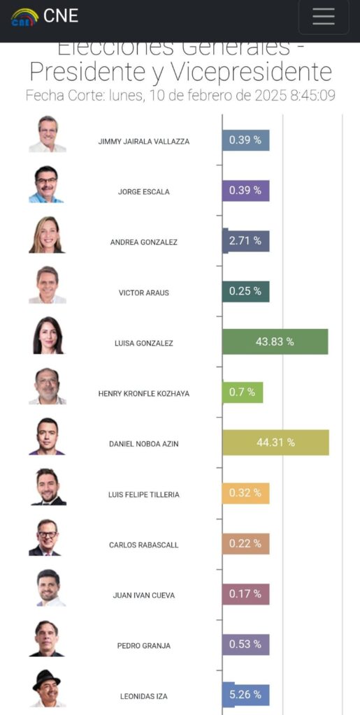 Estos resultados da como resultado a que ambos tendrán que verse las caras el proximo 13 de abril, en una votación que resultará definitiva. Con más del 91% escrutado, Daniel Noboa obtiene un 44,3% frente al 43,8% de Luisa González. El presidente había aparecido como favorito en las encuestas y su equipo de campaña instaló la idea de que lograría la mayoría absoluta y no habría necesidad de otra votación, sin embargo con el movimiento de los resultados es practicamente un hecho de que habrá segunda vuelta en Ecuador.