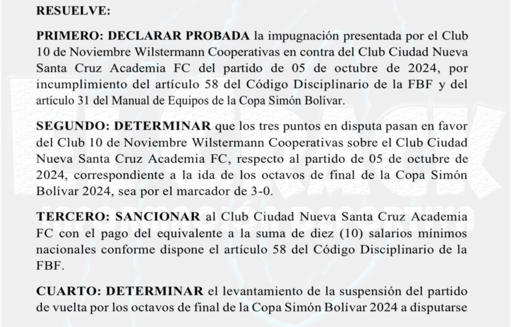 El Tribunal de Disciplina de la FBF decidió dar como válido el reclamo de Wilstermann Cooperativas contra Academias Nueva Santa Cruz dentro la Copa Simón Bolívar, por alineación indebida.