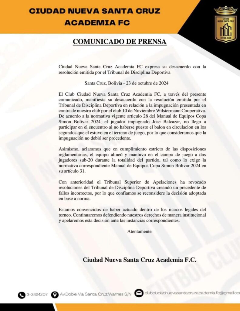 Por su parte Ciudad Nueva Santa Cruz Academia FC emitió ayer un comunicado donde asegura que irá ante los tribunales correspondientes entendiendo que el falló emitido por el Tribunal de Disciplina Deportiva de la FBF no es el correcto.